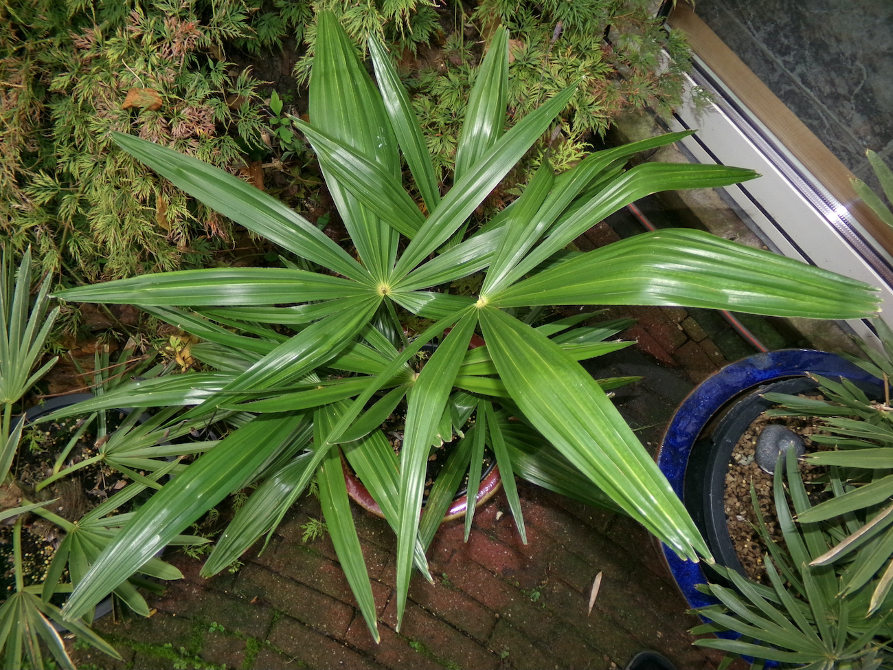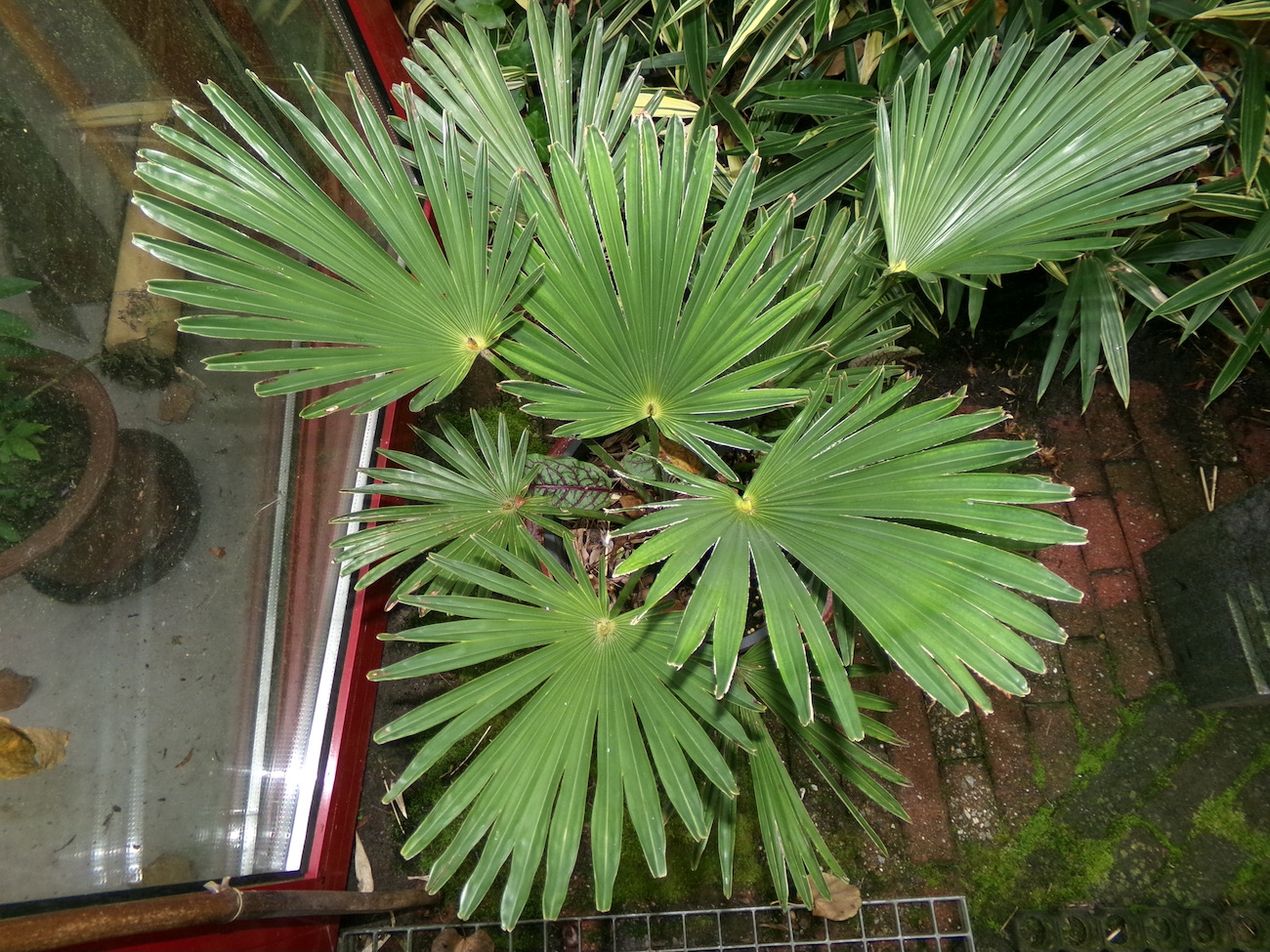 Ik heb meerdere malen Trachycarpus fortunei met wagnerianus pollen bestoven en alle zaailingen lijken op de moederplant fortunei op één na, een zeldzaamheid die het fenotype van de vader wagnerianus heeft. Deze is een aantal jaren geleden gezaaid en wordt gekenmerkt door een zwakke groei met afwijkingen in de gevormde bladeren. Vergelijk het met een vitale wagnerianus van ongeveer dezelfde leeftijd.