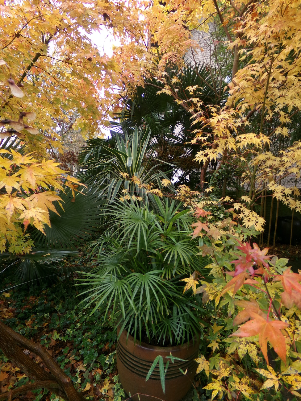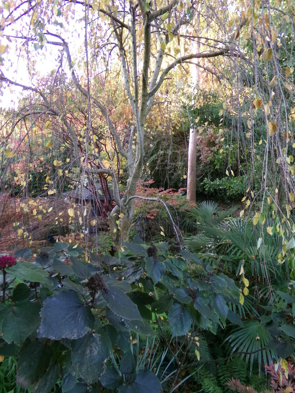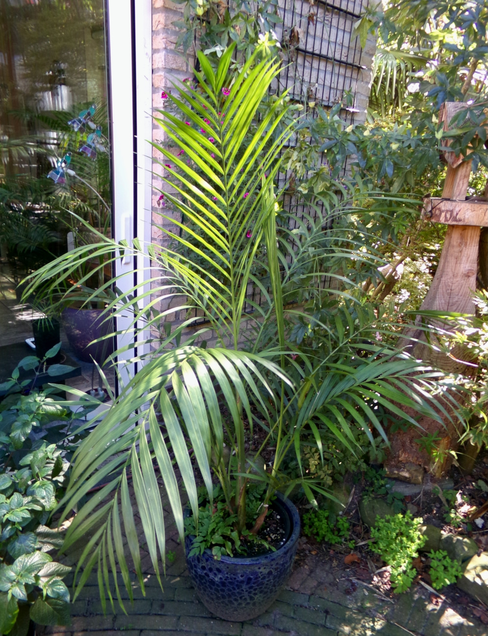 Rob, je ziet dat de geminisectus nog niets is opgeschoten. Met krap 2 waaiers en een speer is het resultaat aan het einde van elk seizoen ongewijzigd. Als kuipplant gedijde deze beter. De tuin is essentie ongewijzigd met uitzondering van de grotendeels geruimde bamboe. De rhizomen zijn achtergebleven en bezorgen ons nog werk genoeg. Voorzover mogelijk zijn er andere planten ingezet. Bij het open rhizoom van Phyllostachys is nog wel een plantgat uit te hakken. Bij Fargesia is dat niet te doen zonder professioneel materiaal.