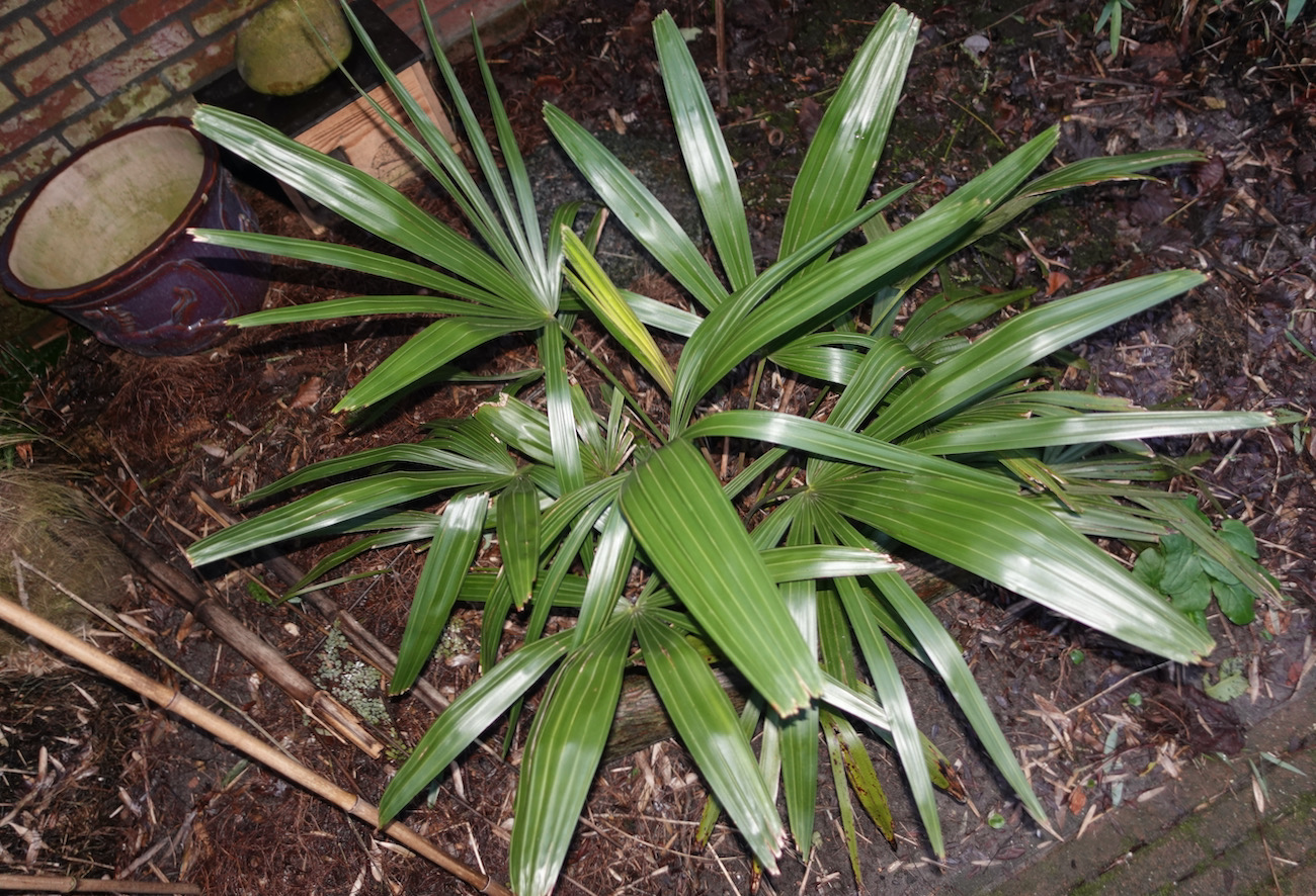 Heb je bij al dat fraais ook een Rhapidophyllum hystrix. Het is een van mijn favoriete palmsoorten, klein maar fijn en goed winterhard. Ik heb de indruk dat deze palm niet erg wordt gewaardeerd onder de palmvrienden. Groot, groter, groots vinden wij (mannen) toch belangrijker. :lol: De naaldpalm is een langzame groeier waar je het beste jong mee begint. Mijn 2 exemplaren arriveerden als zaailing maar het langlevende blad heeft nu zo'n 40 cm Ø. En het kan nog groter zag ik een aantal jaren geleden bij Kimmei. Jonge planten worden momenteel niet aangeboden en oudere exemplaren zijn prijzig - € 1000 of meer.
