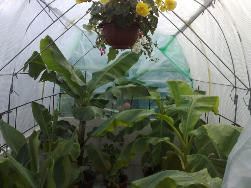 3 zomers geleden( deze meegeteld) kocht ik 3 trachycarpussen en een bananenplant, om zo mijn tuin een wat tropische sfeer te geven, en die banaan heb ik de winter erop goed ingepakt, maar is die helaas toch kapot gevroren. toen heb ik vorige zomer 6 stekjes gekocht, waarvoor ik 120km op en neer moest rijden omdat er dichterbij niet aan te komen was, en die wilde ik niet weer kapot laten vriezen, dus heb ik een demontabel tuinkasje gemaakt van een flinke restpartij incomplete rozenbogen die ik gehad heb. Ik heb toen bij een handelsonderneming wat ijzer bij gekocht voor 1 euro de kilo, om zo de bogen van de kas te maken en om de bestaande delen aan te passen, en dat