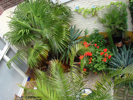 Mijn naam is Rick, ik woon in Utrecht-stad en heb daar een klein beschut stads/patiotuintje en een wat groter dakterras op het zuiden. Zo'n 16 jaar geleden is bij mij het exotenvirus toegeslagen na aanschaf van een 'leuk, klein palmpje' wat in een tuincentrum helemaal in zijn eentje tussen de meer reguliere tuinplanten stond. Het bleek een Trachycarpus Fortunei te zijn, die het nu altijd nog goed doet en inmiddels is uitgegroeid tot een aardige boom. Snel daarna sloeg het exotenvirus toe en kwamen er allerlei exoten bij. Inmiddels heb ik nu vrijwel alleen nog maar exoten, grotendeels mediterrane, maar ook bijvoorbeeld een zantedeschia aethiopica, als kleine knol gekregen in Ecuador.
