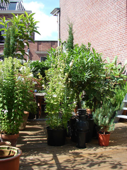 's Winters is het dakterras een flink stuk leger dan op de foto's, omdat daar de koude wind veel meer aanwezig is dan in het beschutte tuintje. Dan staan daar alleen de echt winterharde planten nog. Dit jaar ga ik wel proberen een paar planten op het dak te houden zoals de trachelospermum jasminoides (toscaanse jasmijn), eventueel een beetje ingepakt.