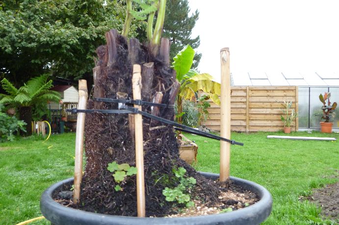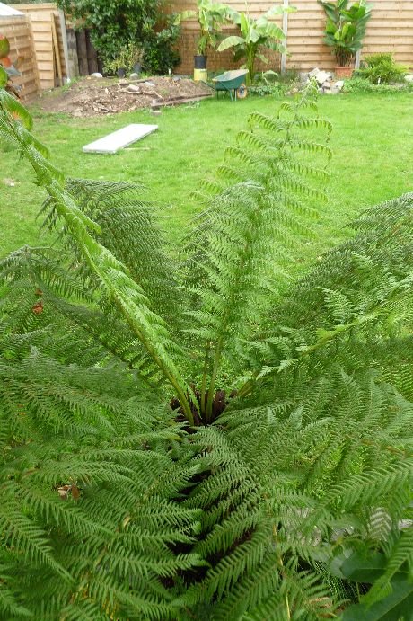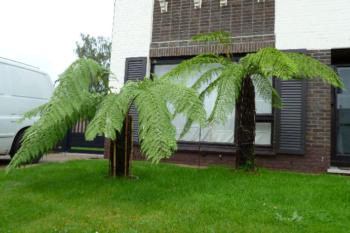 Dicksonia's in de voortuin waarvan de grote in volle grond