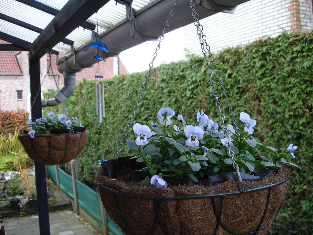 om het leed wat te verzachten dat straks de tuin bijna leeg zal zijn heb ik 2 hanging baskets opgevuld met winterharde violetten