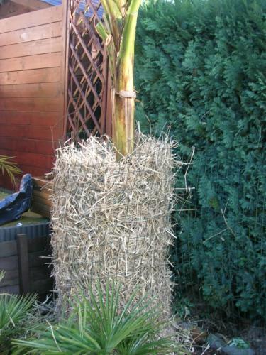 Daarna wikkel ik het geheel in met vliesdoek. (zoals een mummie :D ) Je zorgt er maw voor dat je telkens weer wat overlapt. Deze vliesdoek heeft 2 functies: het houdt de koude nog wat extra tegen en houdt het stro vrij droog. Zelfs bij hevige regenval....Bovendien is het vooral luchtig. Je moet opletten dat u banaan niet "verstikt". Bovenaan even iproviseren... Ik heb dit jaar eens geopteerd om een plastieklaag bovenaan an te brengen en dit om te vermijden dat er al te veel water langs boven binnenkomt.