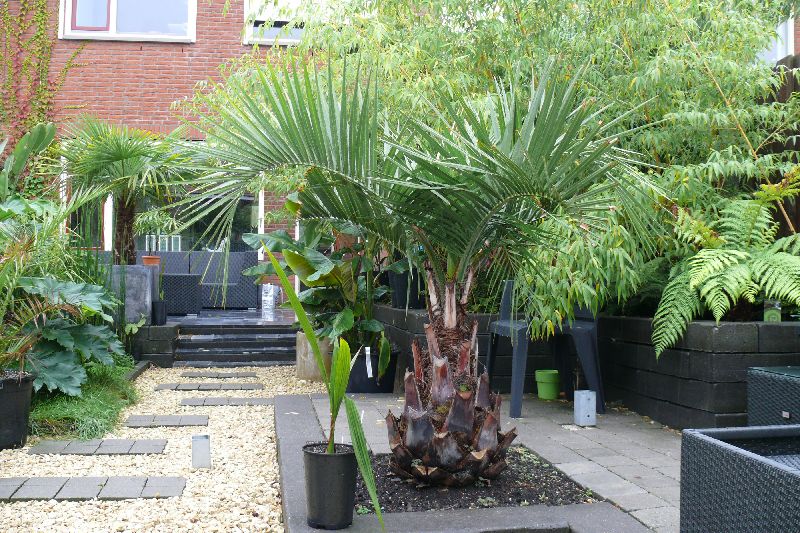 @Eddy, op foto 4 zie je op het midden terras een Butia eriosphata. Deze heeft het toen niet overleefd en is het jaar daarop vervangen door een Butia capitata.