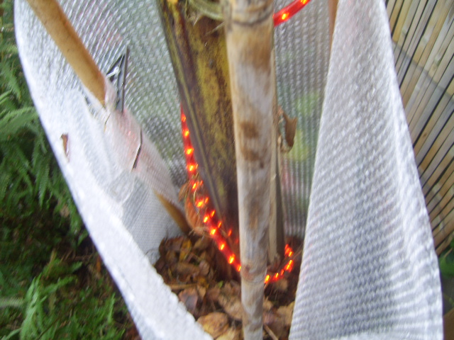 Benieuwd of het deze winter wel zal lukken,nu eens geprobeerd met een zeil aan de buitenkanten van de houten constructie,binnenzijde met noppenfolie rond de stam van de Musa Basjoo een lichtslang van 150 watt,en daarrond ga ik dan wat vliesdoek aanbrengen.