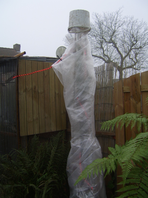 niet echt warm werd met de lichtslang, ik ga morgen doeken rond de stam binden met de lichtslang binnenin tegen de stam en terug de noppenfolie er rond draaien :? opnieuw een paar uurtjes zoet