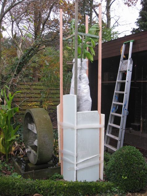Da's ook mijn idee, ik ben een beetje lui en heb ook geen zin om de hele winter op zo'n constructie te kijken die bovendien nog geld kost (de lichtslang) én veelal geen garantie op een overlevende banaan geeft... ik heb de mijne dus vandaag uitgegraven, en op 10 min is dat gefikst en ze kunnen gewoon in het donker overwinteren.