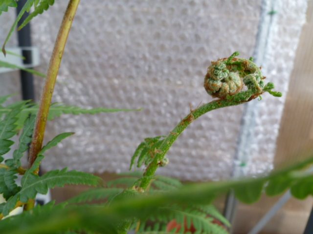 De sporendragende D.Antartica heeft toch al wat vorstschade..De nieuw uitgerolde veren kunnen blijkbaar weinig vorst verdragen,veren zijn 1.5maand terug uitgerold.
