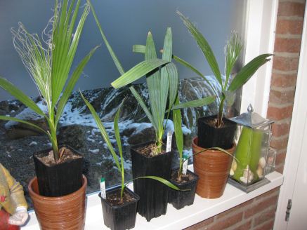Hallo, ik ben een beginnende palmfreak en ik heb een aantal vragen over het overwinteren van mijn zaailingen en mijn minder goede ervaringen hiermee. Ik ben in het bezit van een aantal zaalingen van 2 a 3 jaar oud waaronder trachycarpus wagnerianus en fortunei, sabal minor en wagnerianus filleferia. Ze hebben het hele jaar in de koude kas gestaan en hebben het daar goed gedaan. Na het binnen halen eind oktober heb ik na een maand de volgende eigenschappen waargenomen bij de zaalingen. De onderste bladeren werden vanaf bovenkant blad langzaam bruin en na verloop tijd ging het blad zich dichtvouwen waarna het langzaam afsterfde. Ik heb de planten alleen water gegeven als de bovenste 2 cm droog aanvoelde en verder niet meer bemest. De kamer waar ze zich bevinden heeft beperkt licht en de temperatuur is er constant zo rond de 12 graden. Nu heb ik onder in de hal ook enkele exemplaren staan van de wag. filleferia en sabal minor die het wel goed doen. Deze staan echter voor een venster met veel lichtinval maar de temperatuur is daar niet veel hoger als 9 graden. Nu heb ik gelezen dat de filleferia niet onder de 18 graden overwinterd dient te worden. Wat zijn de ideale omstandigheden waaronder de zaailingen horen te overwinteren en wat doe ik eventueel fout. Op de eerste 2 foto s zie je een sabal minor die zich helemaal heeft dichtgevouwen en de tweede laat een fortunei zien waaraan zich een blad bevindt dat bruin wordt en zich ook al gaat dichtvouwen. De derde foto is de sabal minor en filleferia die inde hal koel staan met veel licht en die het wel goed doen.Wie kan mij helpen om mijn zaalingen er weer boven op te helpen. Alle tips zijn welkom.