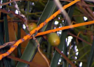 Spijtig geen betere foto van de palm, maar als ik mag gokken op een combinatie van bovenstaande tros zaden en de palm denk ik eerder aan een oliepalm (Elaeis guineensis)???