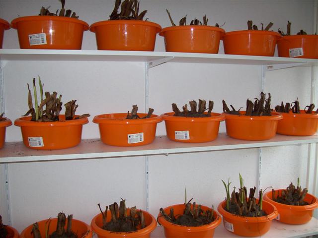 tegen eind januari zijn de meeste al enigszins uitgelopen haal ze dan uit de bakken,verwijder de grond die er nog aanzat van het uitspitten en ''scheur'' er dan een paar mooie uitlopers af(minimaal 2 groeipunten).scheuren is het verdelen van de wortelstok(rhizoom),naar eigen inzicht.