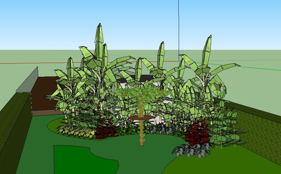Dit alles heb ik eens uitgetekend in SketchUp om mijn idee een beetje duidelijk te maken. Heb zoveel mogelijk de werkelijke afmetingen van de planten gerespecteerd maar alles staat een beetje te dicht op elkaar getekend, maar dit zal toch nog enkele keren verschuiven.