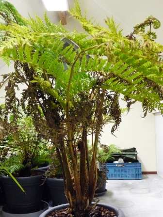 Ik heb mijn cyathea's regelmatig buiten laten luchten zolang er geen vorst was (+5 overdag en +2 s'nachts). Deze lijken de winter goed te zijn doorgekomen en beginnen reeds hun rollen uit te werpen.