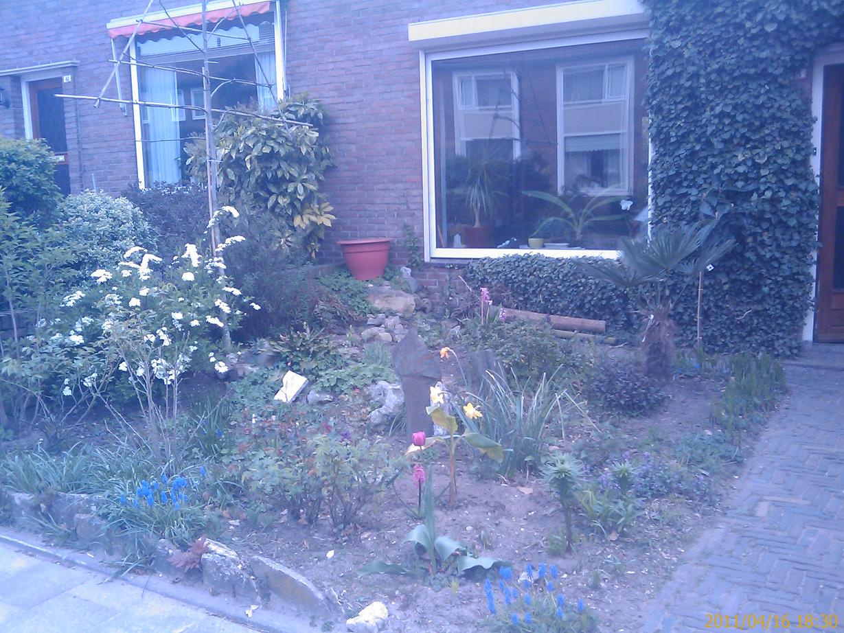 Als ik dan een gat in de grond graaf dit gat opvul met een brouwsel van de grond zelf, compost, klassieke universele bladgrond, koemestkorrels, een beetje blauwe korrel, een beetje guano, lavakorrels, lavagruis en dan de plant zelf, met aarde en al zoals ie erg gemakkelijk uit de pot komt in de grond steek ... waarom zou die plant dan minder goed tegen de koude kunnen als dat ik em in de pot buiten had laten staan. Niets schade aan de wortels tijdens het verplanten (wat vanzelfsprekend erg belangrijk is), uiteindelijk nog een laag schors van 5 cm eroverheen.