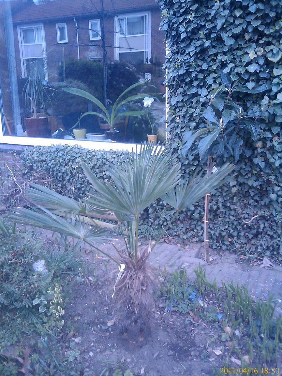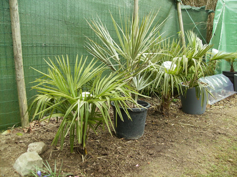 Erna als ik u een plezier kan doen met bijgevoegde foto, enkele kleine trachies in de volle grond, de linkse heb ik ook gisteren in de volle grond gezet; tussenin een Nannorhops Ritchiana Silver. Deze laatse bescherm ik nog tegen teveel vocht indien nodig. Ik ga ervan uit dat ik de Nannorhops Ritchiana Silver nooit water moet geven.