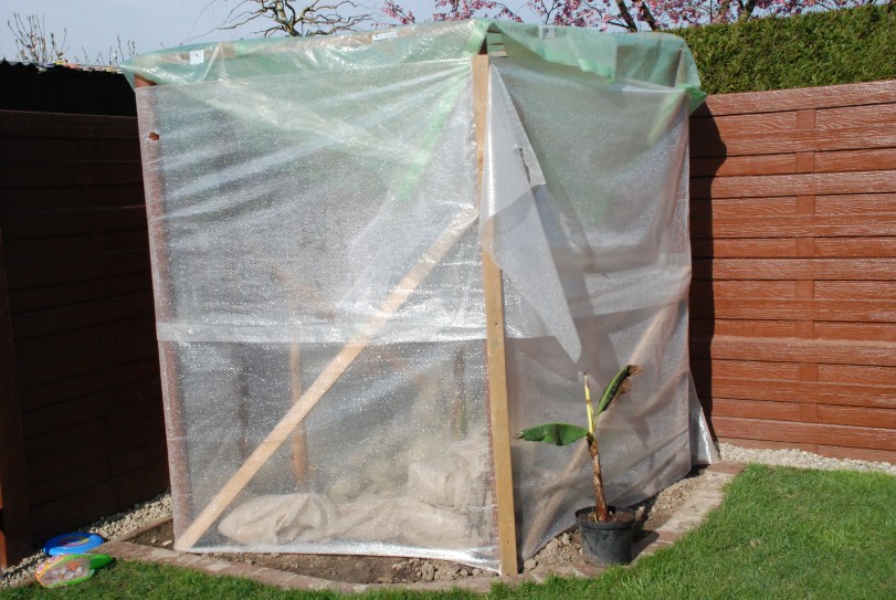 De Phoenix is beschermd geweest met 4 palen in de grond,daarrond bubbelfolie,bovenaan ook een platsiek zeil,en dan nog eens een blauw plastiek zeil om de regen buiten te houden.