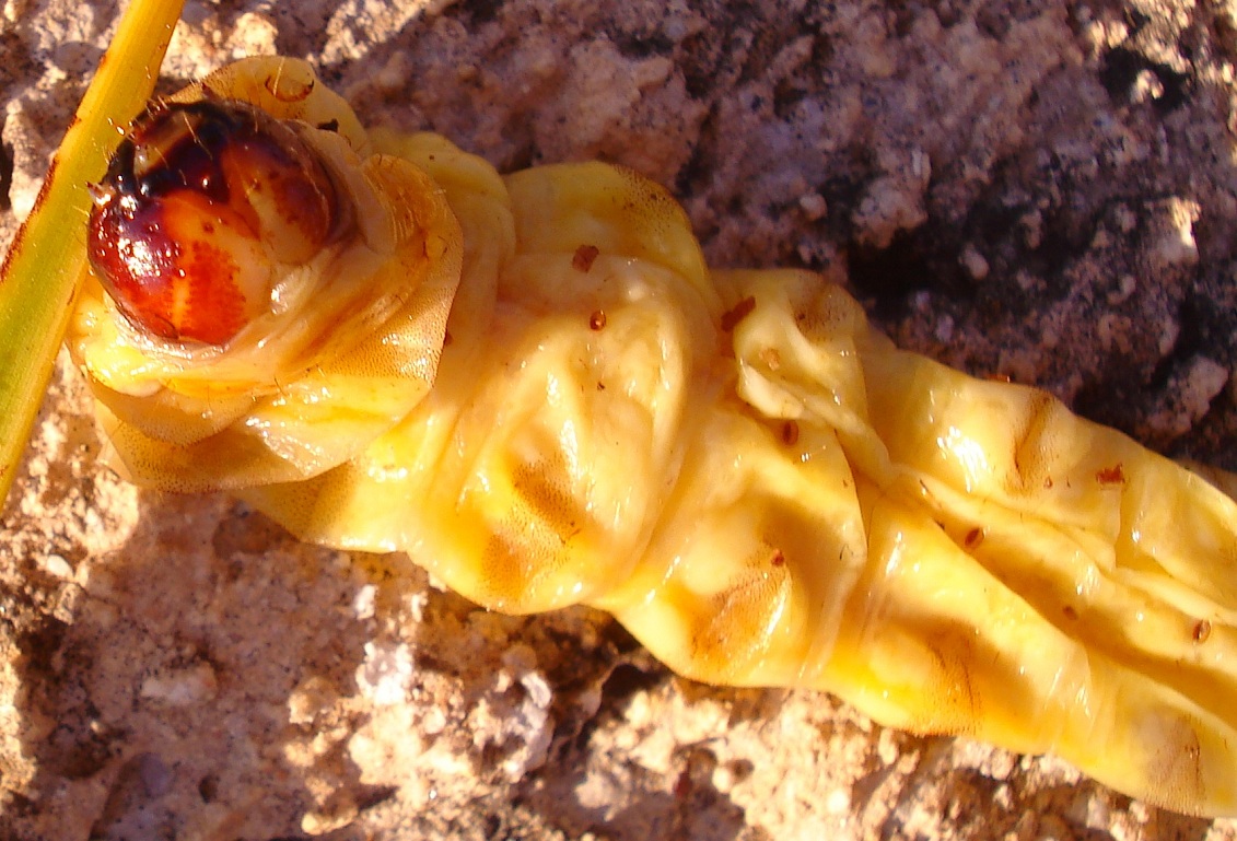 Naast de observatie van de opvallende volwassen palmmotten (ze zijn groot, mooi en actief overdag), is ook de vraatschade door de larven gemakkelijk te herkennen: Gewoonlijk treft men zaagmeel aan op de palmkroon of stam. De bladeren zijn aangeknaagd en vertonen perforaties. Inwendig in de stam zijn er galerijen gevormd.