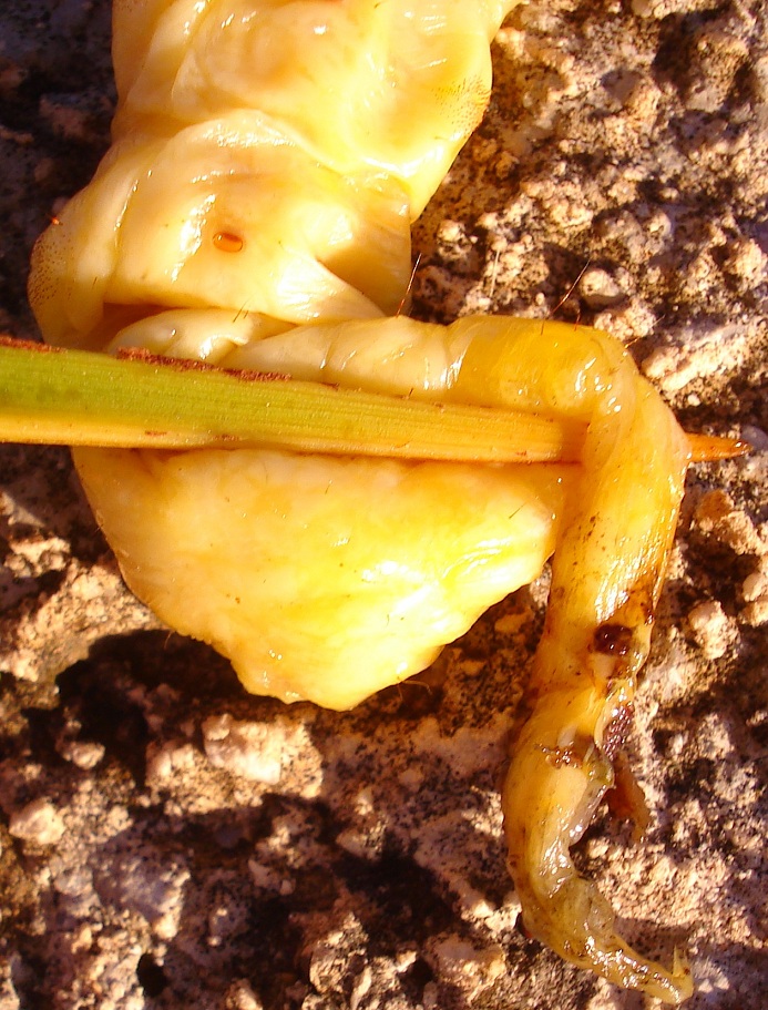 Men kan ook een afwijkende ontwikkeling van de bladknoppen waarnemen, alsook gedraaide stammen.