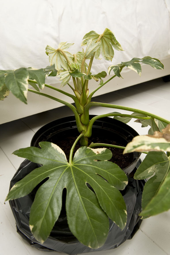 hoge fatsia japonica heeft door verhuizing onderaan veel blad verloren