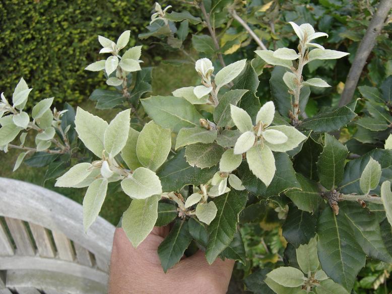 Een 5- tal jaren geleden zaaide ik enkele eikels van de steeneik. Groot is nu mijn verbazing als ik naar de jonge blaadjes kijk. Bij één boom zijn die groen en bij de andere rood. Verder zien beide boompjes er identiek uit.