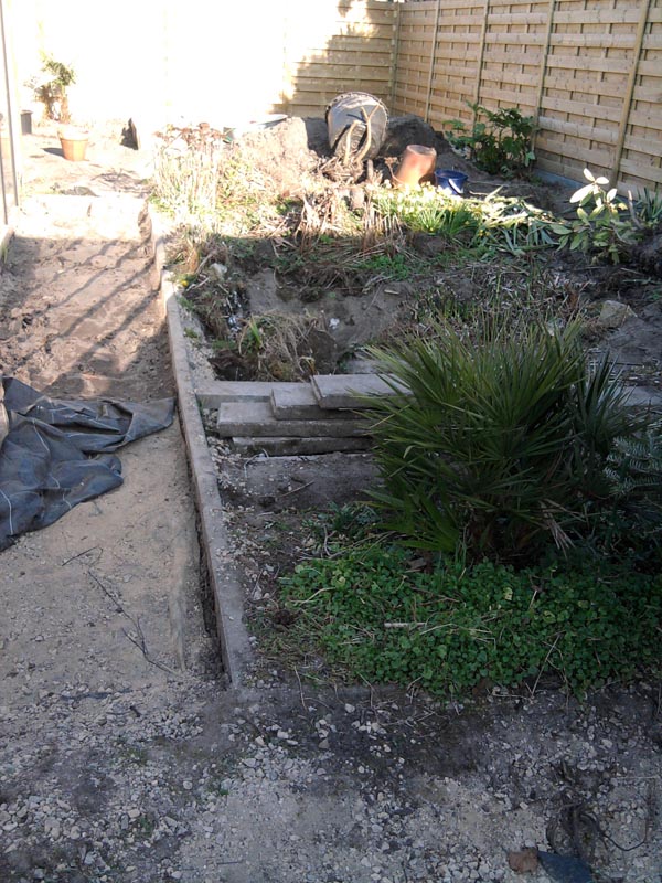 Rond het onregelmatige vijvertje bevonden zich een klein terrasje, dolomietpad, en struiken. Dat moest allemaal weg en vlak gemaakt worden.