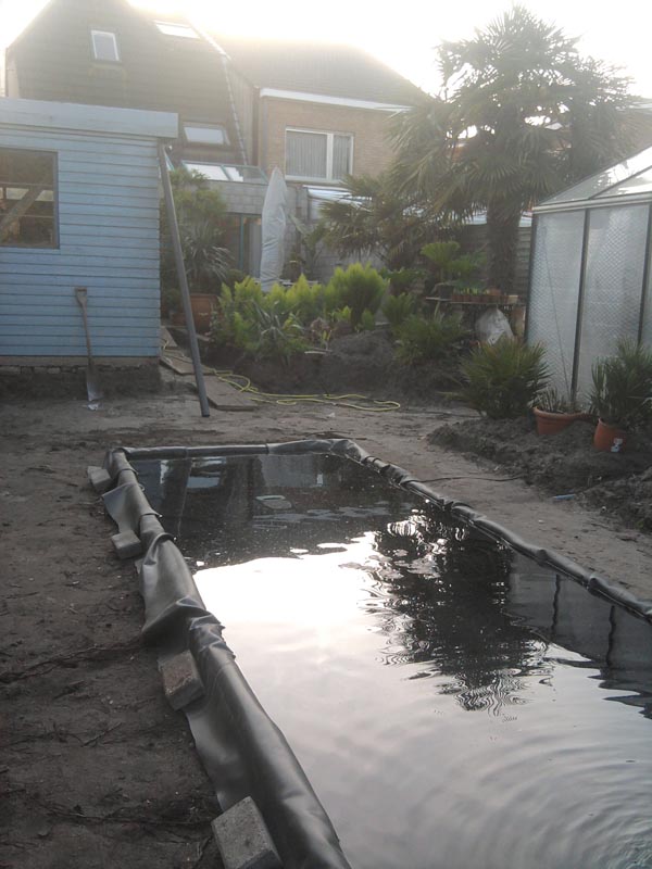 Nu nog het aanbrengen van gestabiliseerd zand rond de vijver om de houten 'vlonder' aan te leggen rondom rond (niet zelf gedaan, geen tijd ervoor). Links komen er Chamaerops humilissen en rechts een combinatie van Phormium tenax en Yucca filifera. Hier is weinig variatie in de beplanting om het strakke en open karakter aan te houden.