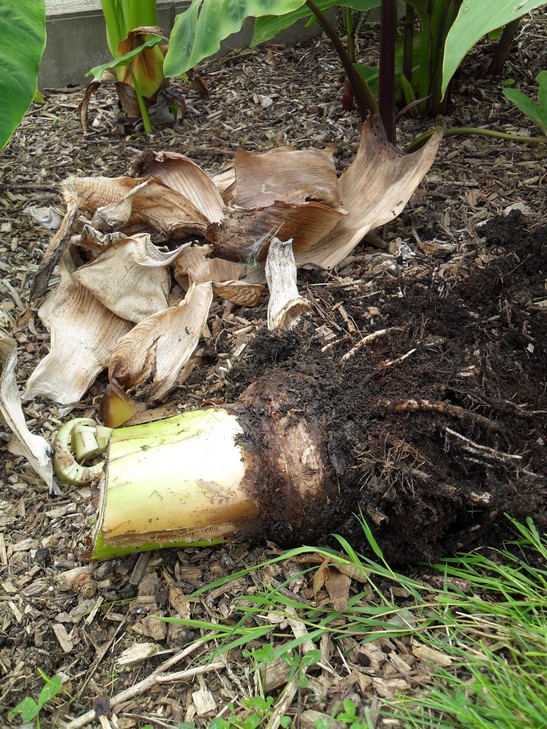 Tijdens de forumuitstap naar de KULeuven vorige vrijdag, kregen we een interessante uitleg van de prof over hoe ensete's kunnen vermeerderd worden. De knol uitgraven en in stukken delen. Dit zou volgens hem ook lukken met de groene ventricosum. Die had ik jammer genoeg niet op overschot, dus heb ik maar een Maurelli opgeofferd voor de wetenschap.