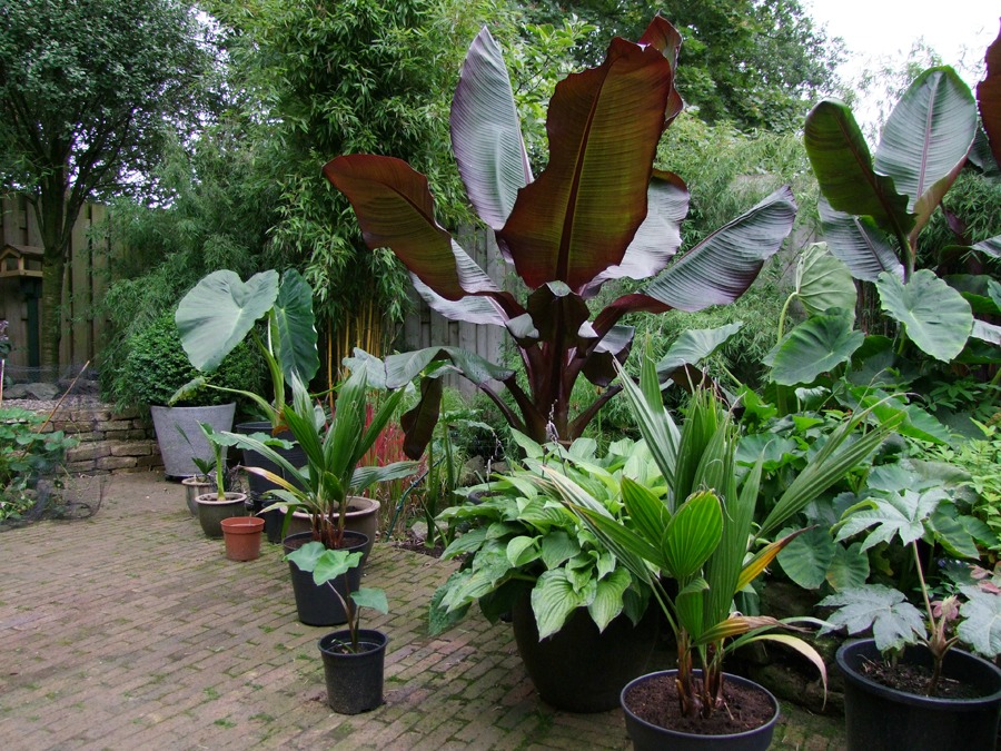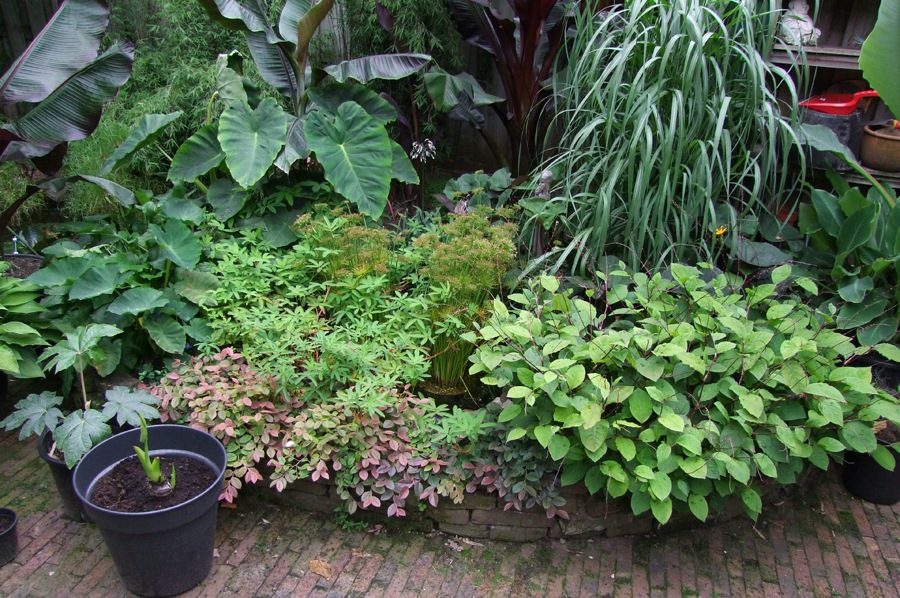 En dit is onze exotentuin in aanleg. De oude aanplant is aan een kant van de tuin er allemaal uitgehaald.Je ziet vanzelf wel de overgang. Sommige stukje zijn nog wat kaal maar daar komt beslist verandering in als we het potspul in de volle grond gezet hebben en de ander potten een plaatsje. Er moet ook nog een Dicksonia Antartica in maar daar heb ik even mee gewacht omdat in nog niet wist waar die neer te zetten.....eerst een beetje overzicht krijgen. ook wil ik graag nog de Persicaria Red Dragon een plekje gaan geven als ik hem heb....Maar zo ziet het er nu weer uit.