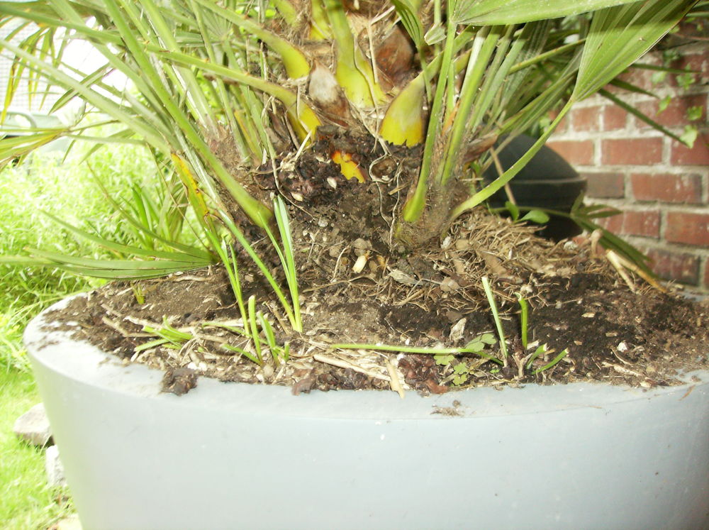 De meeste van onze palmen zijn trage groeiers, sommige waaronder mijn lieveling de Trithrinax Campestris zelfs extreem traag. Een van de beste groeiers hier bij mij is een wat grotere Chamaerops Humilis, ik heb deze plant sinds mei vorige jaar en hij is met success de winter doorgekomen. Aanvankelijk dacht ik, ik zet hem in een pot, dan kan ik hem eventueel een weekje of 2 in de garage zetten als het toch te koud wordt. Maar plant en pot tesamen zijn toch te groot om te verplaatsen. Hij heeft er zo een zin in dat hij zichzelf uit de pot aan het duwen is. Onderstaande foto' s tonen dit aan.