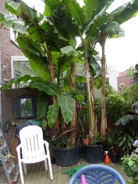 Voor mijn bananen is de zomer echt niet verkeerd Toen ik ze buiten zette in het voorjaar en eentje in de volle grond hadden ze geen enkel blad.