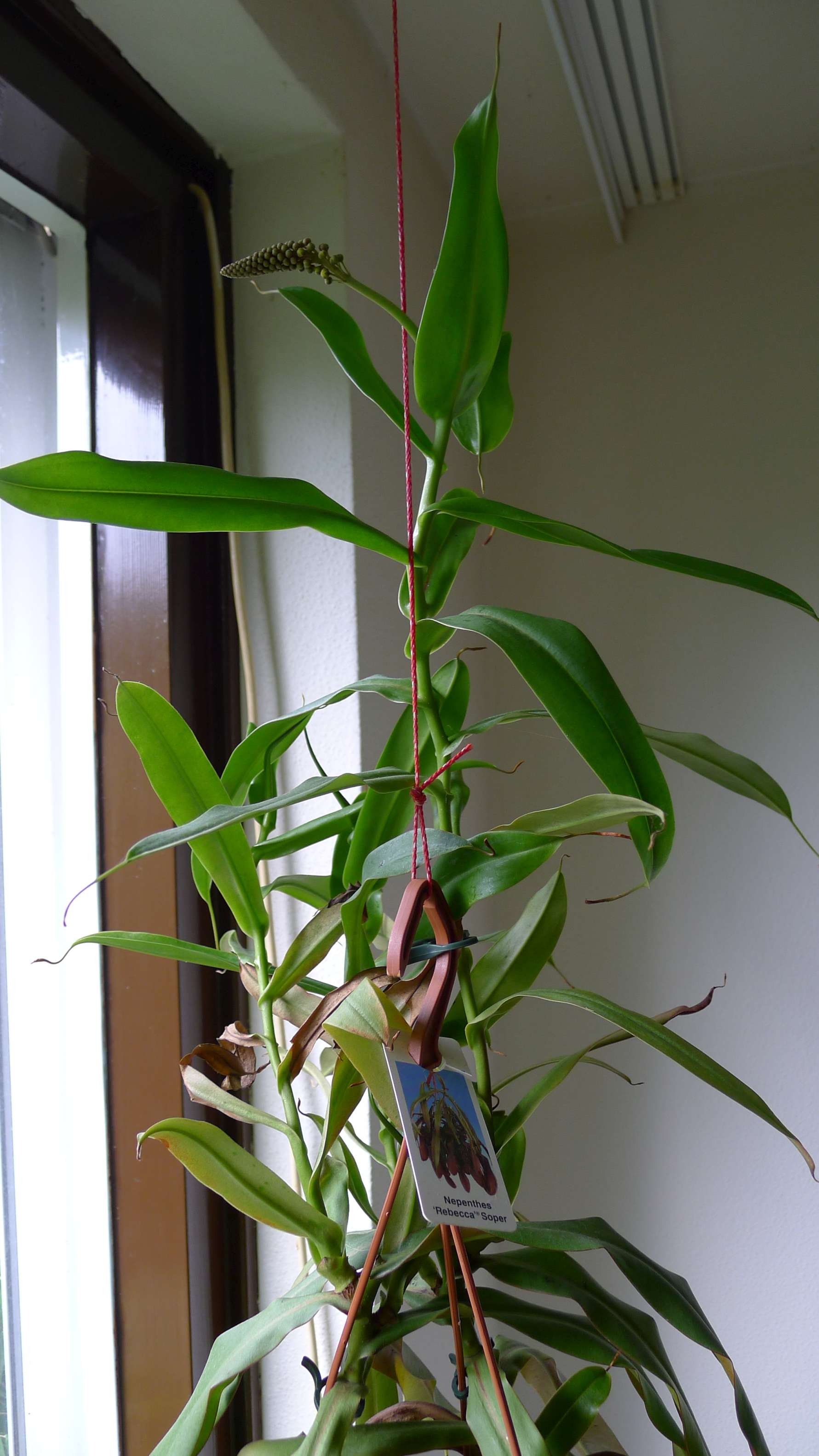 Van beide nephenthes van mij zijn al maanden geleden de kelken verdwenen, maar bij 1, de 'Rebecca' Soper komt nu wel bloei. De andere, gelabeld 'alata', groeit ook aardig, maar geen bloei. Zouden er ooit weer eens kelken komen?