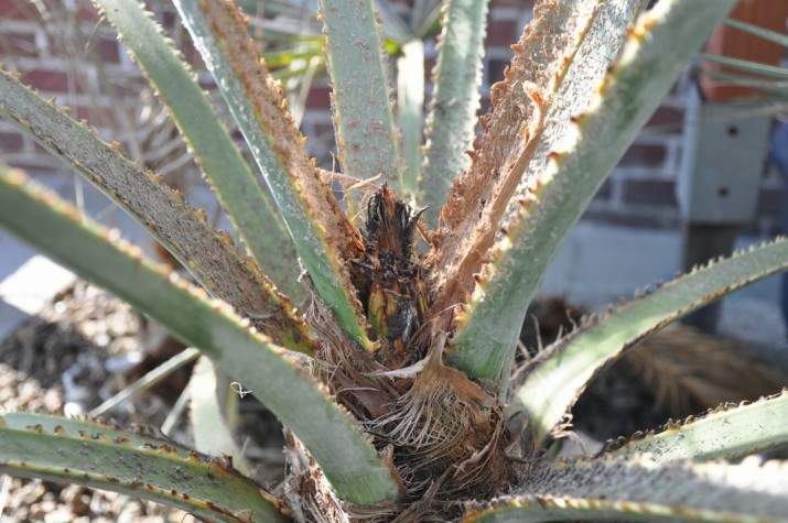 mijn eerste ervaring met twee Brahea 's in de volle grond ,na de winter alle bladeren stuk ,en de speer kon je er zo uit trekken end off the story dacht ik ,na een lange tijd gewoon uitgegraven en ergens vanachter in de tuin gezet uit het zicht