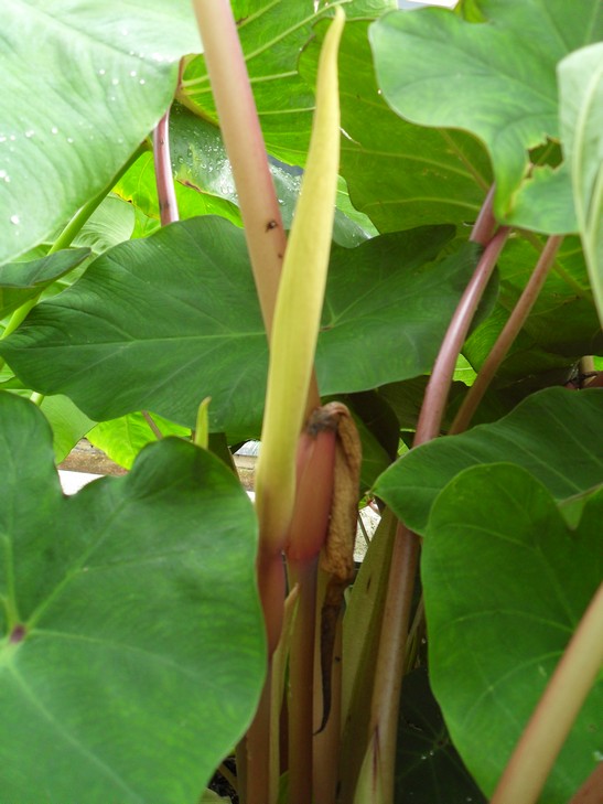 Dit is mijn alocasia macrorrhizza. Ooit als stekje van Eduard gekregen en al flink gegroeid. Ik plant deze in volle grond uit tijdens de zomer. Ook buiten kunnen ze een redelijk formaat krijgen. Het is op de foto niet te zien maar er zitten 2 bloemen aan. Ook bij andere soorten colocasia heb ik bloemen, soms 4 tegelijk. Maar er is nog nooit zaad aangekomen.