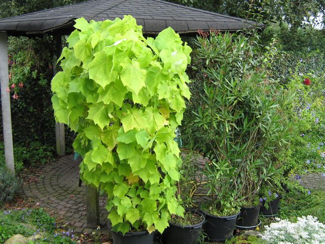 Deze Brugmansia's staan in de vollen grond, en laat ze doodgewoon bevriezen , doe ook de moeite niet om ze uit de grond te halen .Ik kweek ze, een twee à drie jaar op in potten ,als ze zowat uit de potten gegroeid zijn ,zet ik ze na de ijsheilingen in de vollen grond .Dit jaar in het voorjaar, heb ik een gestekte van verleden jaar ,in een 40 liter pot geplant,die ga ik zo groot mogenlijk (zo min mogenlijk snoeien)overwinteren,volgend jaar na de ijsheilingen in de vollen grond ,en laten bevriezen .Op één van foto's sta een Sparmannia africana ,die ook totaal uit de pot gegroeid is ,heb ik stekken van genomen ,en volgend jaar, de vollen grond in ,en laten bevriezen.