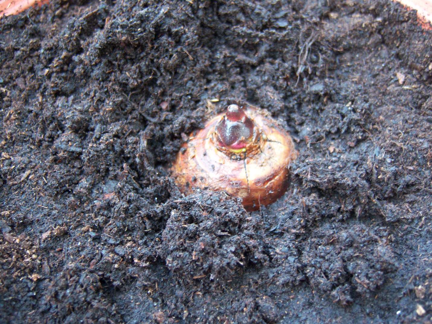 Vlug een wijziging aanbrengen, zonet de knol dieper geplaatst, er verschijnen reeds kleine worteltjes onder het groeipunt. :D