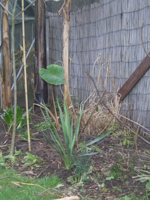gisteren een nieuw stuk gazon weggehaald om plaats te maken voor de musa's, de plant in't midden heb ik al 3 jaar met succes buiten kunnen overwinteren met behulp van een lichtslang, het begint stilaan een reus te worden...
