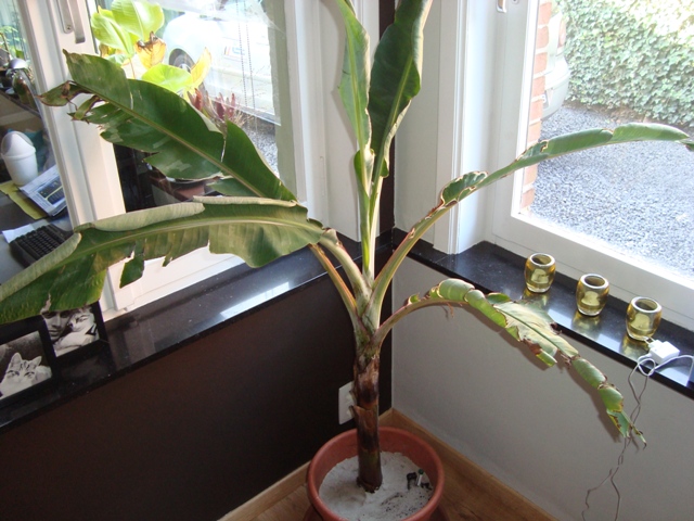 Hij stond ook nog een beetje los in zijn pot en had duidelijk buiten gestaan. Het is volgens mij ook een musa florida, verschil zou hem in de vruchten zitten, Ae Ae heeft een ronde achterzijde van de banaan en de florida zou een achterzijde hebben van de vruchten dat op een fles lijkt. Er zijn al op vele forums discussies over geweest van het al dan niet Ae Ae zijn... en ik ga er mij ook hier niet over uitspreken. De vruchten van de florida zouden ook zaden bevatten en dus ook te zaaien zijn... wat misschien wel goed nieuws is voor degene die hem in bloei krijgt ;) natuurlijk vraag ik mij dan ook af hoe het dan komt dat er geen zaden te koop worden aangeboden van deze plant... We zullen wel zien wat het zal worden.