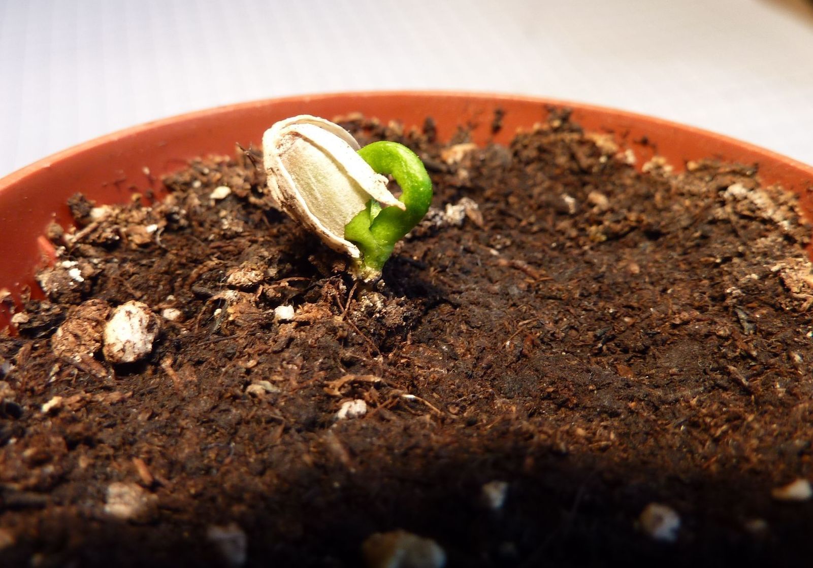 Het zaadje, staat op een warme (20 graden) en lichte plaats. De aarde is altijd vochtig