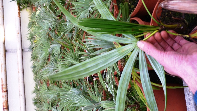 Die geminisectus is een apart ding. Bij ons zijn ze ook silver aan de onderkant maar er zijn ook exemplaren die dat (nog ???) niet hebben. Misschien net zo iets als de princeps sp. nova and stonegate. Zover ik weet hoeft deze natuurlijk niet alleen voor te komen in Noord Vietnam. Zoals je weet ligt het DNA van oreophilus (Omgeving Changmai , Noord Thailand) heel dicht bij de Trachycarpus sp. manipur (grens bhutan - India). Manipur wordt heeft van nature meer wax, stijver blad en vooral veel eerder de witte wax. Het kan afhankelijk zijn van grondsoort en nog een aantal andere elementen (vooral marblestones doen wonderen). Maar ik kweek ze beide in dezelfde grondsoort dus dna gevoeligheid is er zeker ook !! Misschien weet Gary van Coldpalm er meer van want die heeft kortgeleden ook een soort gelijk plantje ontdekt. Ook kan het niet zo zijn dat de zaden elk jaar van verschillende lokatie komen want heb uit dezelfde lichting jaar verschillende zaailingen. Bijgaand wat foto's. (mijn eerste post dus hoop dat het goed gaat...........met de plaatjes enzo)