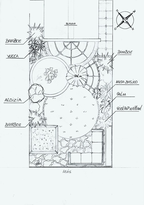 Hierbij nog twee foto's en het ontwerp van de tuin. Ik moet nog de vijverrand