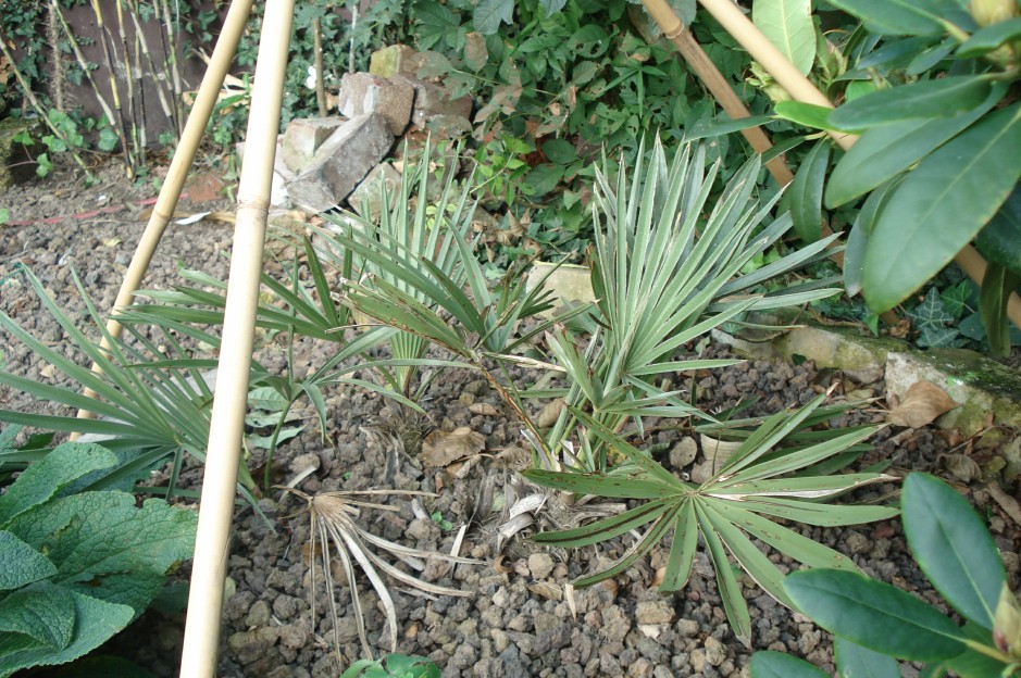 ik heb twee Trithrinax Campestris in de tuin staan , de kleinste heeft zijn eerste winter in de tuin goed doorgekomen ,ik had enkel wat vlies doek en daarover een speciale zak tegen de wind ,deze zomer toch 2 nieuwe bladeren gekregen