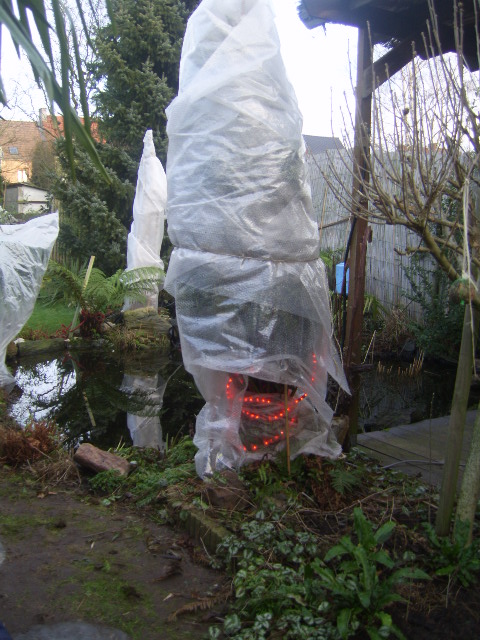 Geen lichtslang, maar in volgorde een hele dikke bamboemat, noppenfolie en puinzak op de kop. Heb de veren terug in de kroon gekruld/gevouwen, en er een laag fleece overheen gegooid.