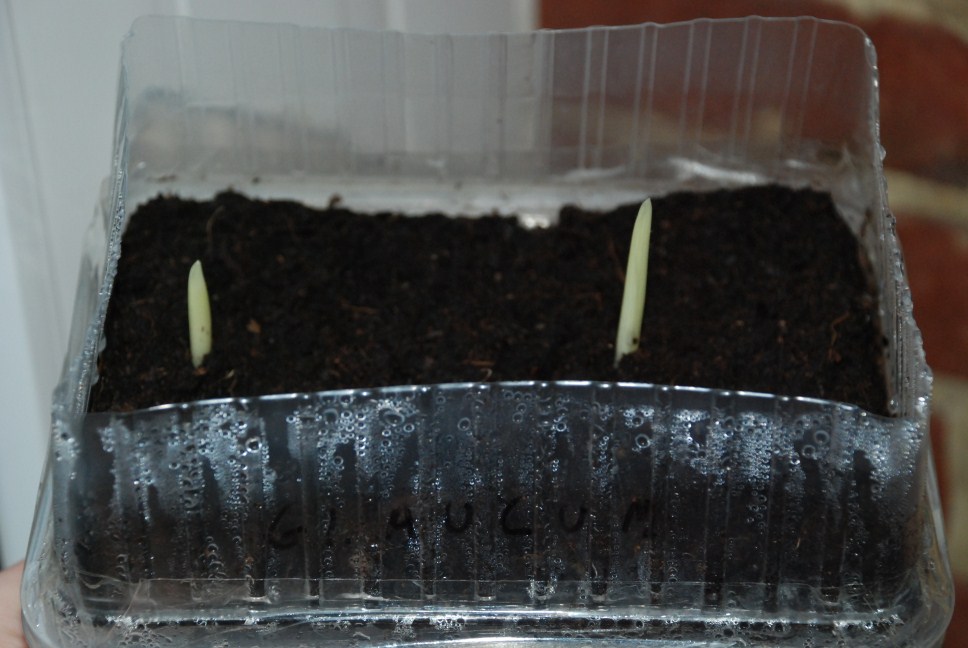 Sedert gisteren de eerste 2 Glaucums tevoorschijn zien komen,op 11/01/2012 in gewone potaarde gedaan en dus gisteren hun kopje boven te zien,heb vandaag al de folie moeten verwijderen daar er al eentje de folie omhoog aan het steken was.