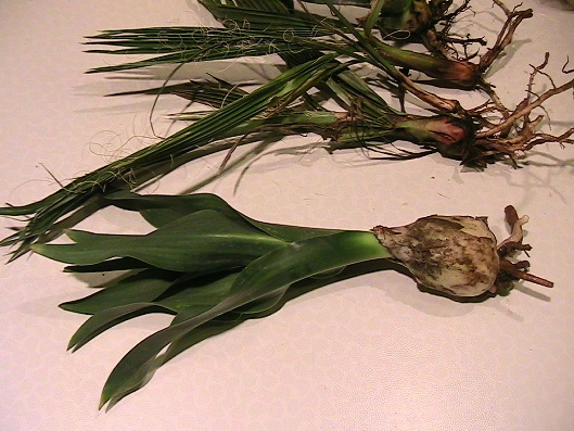 De eerste ken ik niet. Het is een knol zoals een ajuin met een stijf blad zoals van een yucca. De stam zou verhouten.