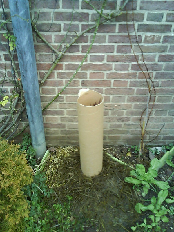 Ik had nog een hele handige kartonnen buis liggen die precies eromheen paste, dus zo geschiede. Ook extra hooi aan de voet gelegd.