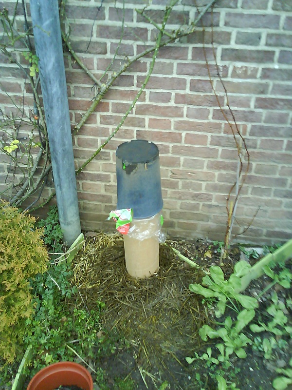 Eerst had ik een plastic bakje over het plantje gelegd. Toen een berg stro erover en daarna de dakpannen. Staat ook redelijk dichtbij de zuidmuur.