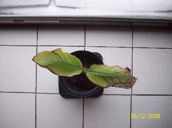 Geen zorgen Patrick. De mijne zag er nog beroerder uit omdat hij tijdens de nachtvorst van eind oktober buiten was blijven staan. Het overgebleven blad was net als bij jou bruin geworden en zag er weinig hoopvol uit. Nu staat hij alweer tijdje binnen en zo'n 2 weken geleden ontdekte ik spint onder het blad :? Na hem bespoten te hebben staat hij weer binnen op een koelere plaats. Vandaag zag ik een nieuw blad opkomen. :)