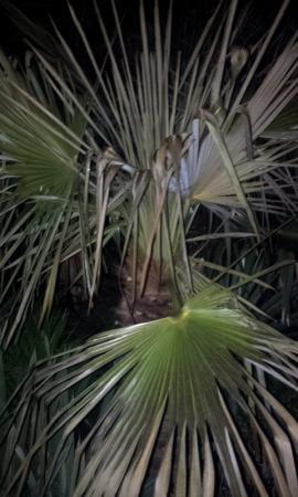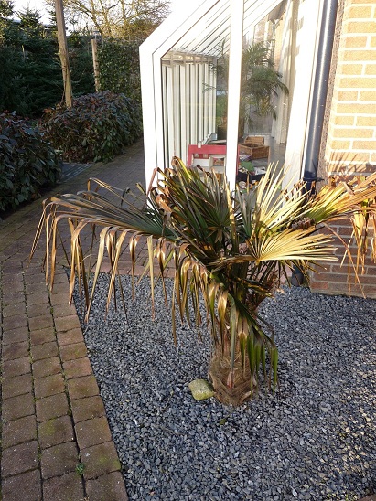 Wat is dit dan? Nee, deze palm heb ik (net zoals de rest) niet toegedekt de afgelopen periode. Toch ziet hij er (als enige) nog prima uit. Viel me wel op dat deze palm vorig jaar uit de grond "geknald" is.